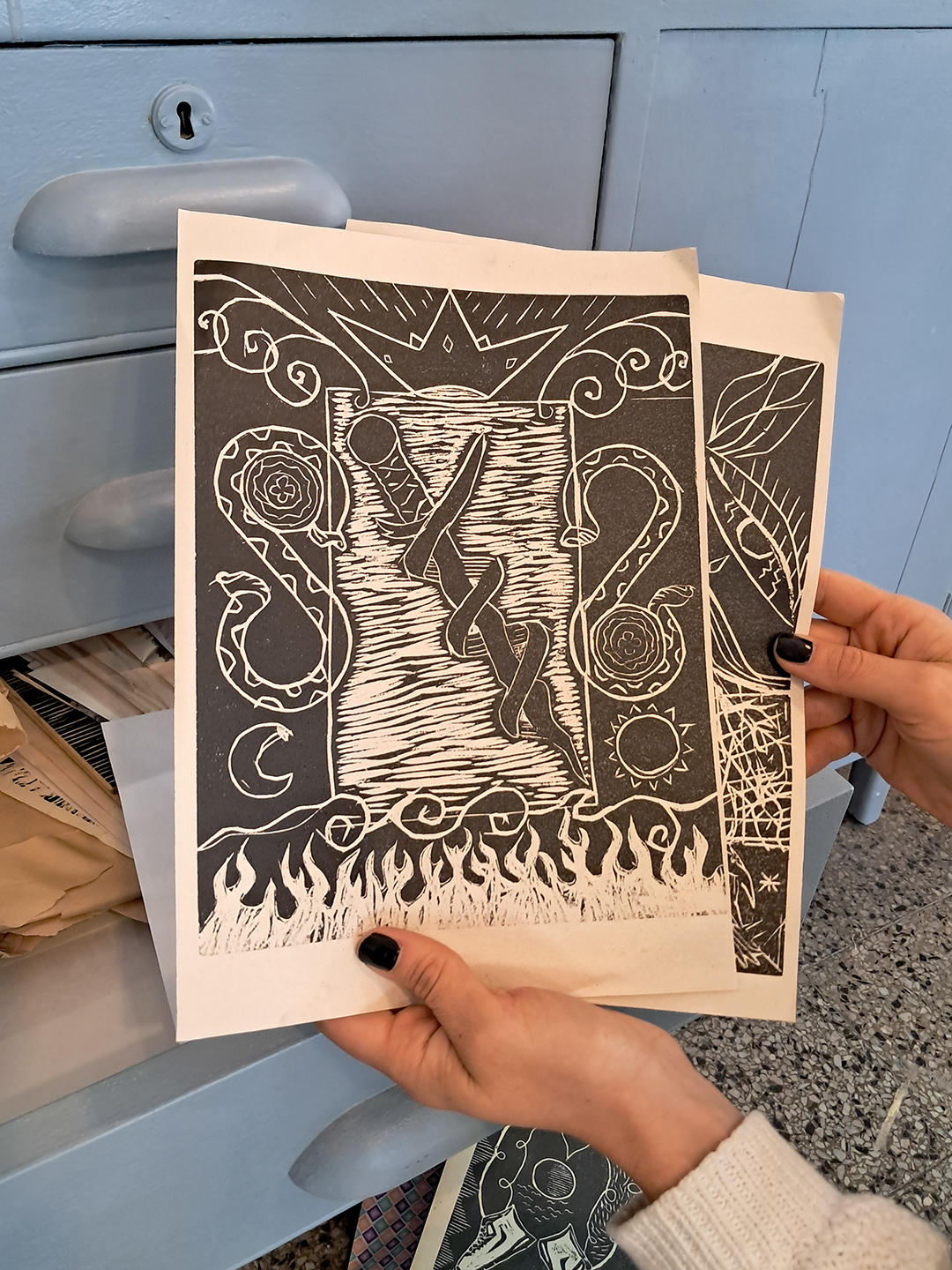 Para mí hay algo en el penal que ayuda en el grabado que es entrar en un tiempo distinto; ahí cada palabra, cada cosa, tiene un nivel de importancia que no es lo mismo que en la calle. Esa atención hace que salgan cosas increíbles. También sirve que haya un inicio y un final. Vas con una idea y eso se materializa; y es un juego de mesa, un fanzine, un grabado que está expuesto en una muestra. El grabado genera entusiasmo porque tiene eso de que compartís un espacio de taller. Estás tallando y estás hablando. Y bueno, te vas conociendo y aprendiendo cosas. A tener paciencia, a no frustrarse, a sostener. Sostener un taller, meterte en un oficio. Un montón de cosas que aprendes además de la técnica.